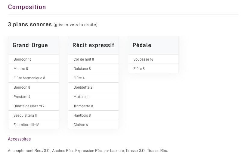 D’esthétique plutôt romantique, cet orgue – comprenant 18 jeux et deux claviers, dont un récit expressif – s’adapte à bon nombre de pièce du répertoire, allant de Buxtehude à nos jours.